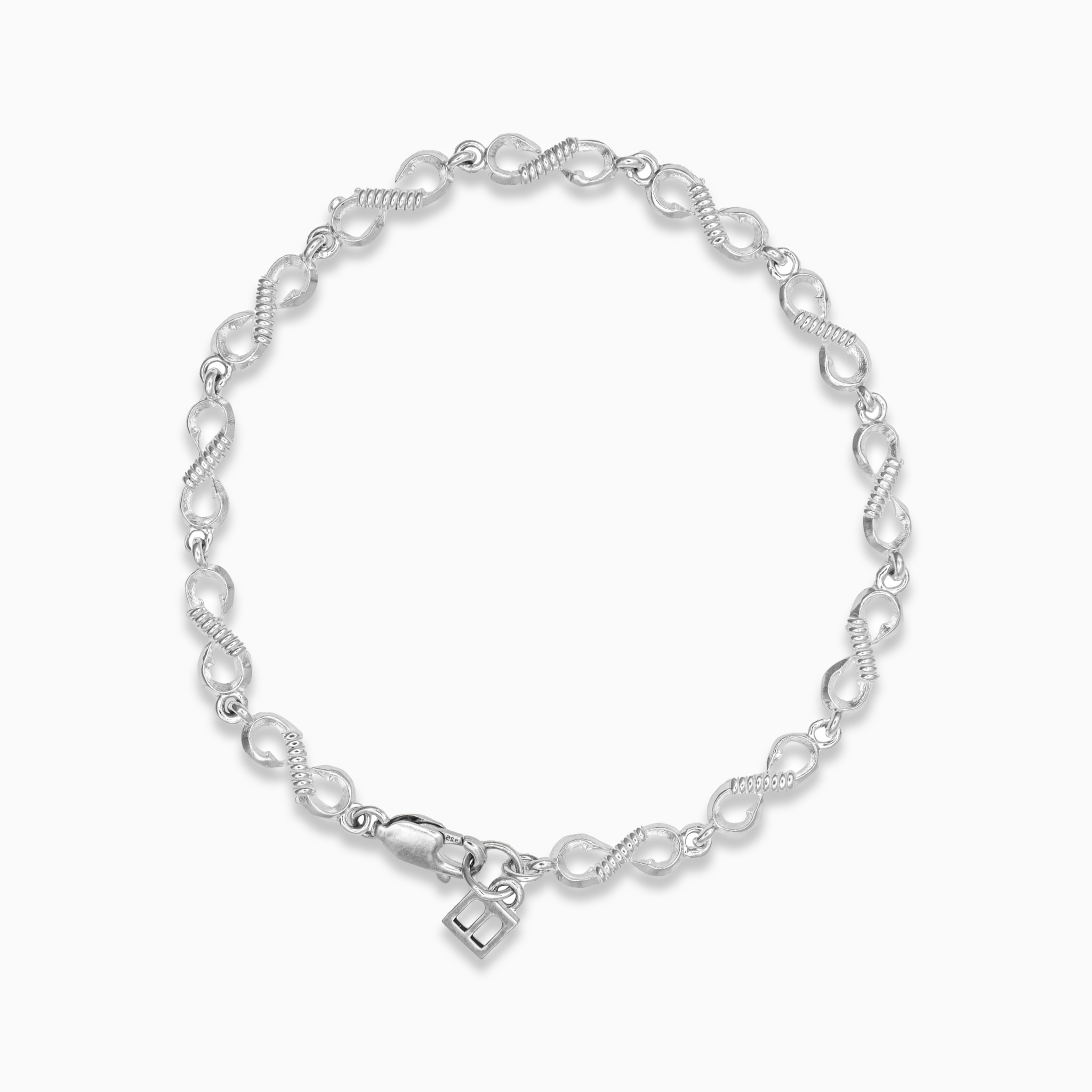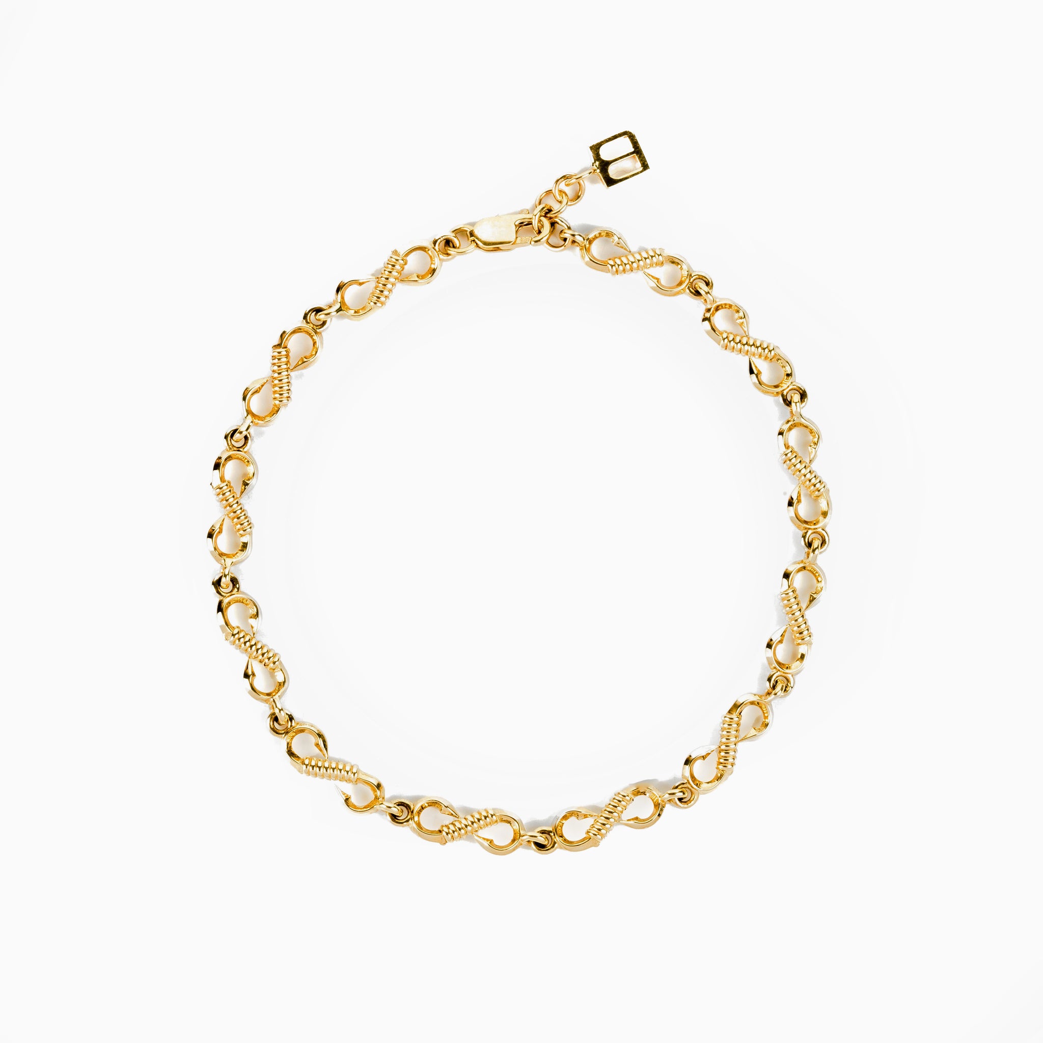A delicate yet distinctive bracelet featuring continuous miniature fish hook links with coil wrap detailing throughout, finished with a signature Moses brand tag.